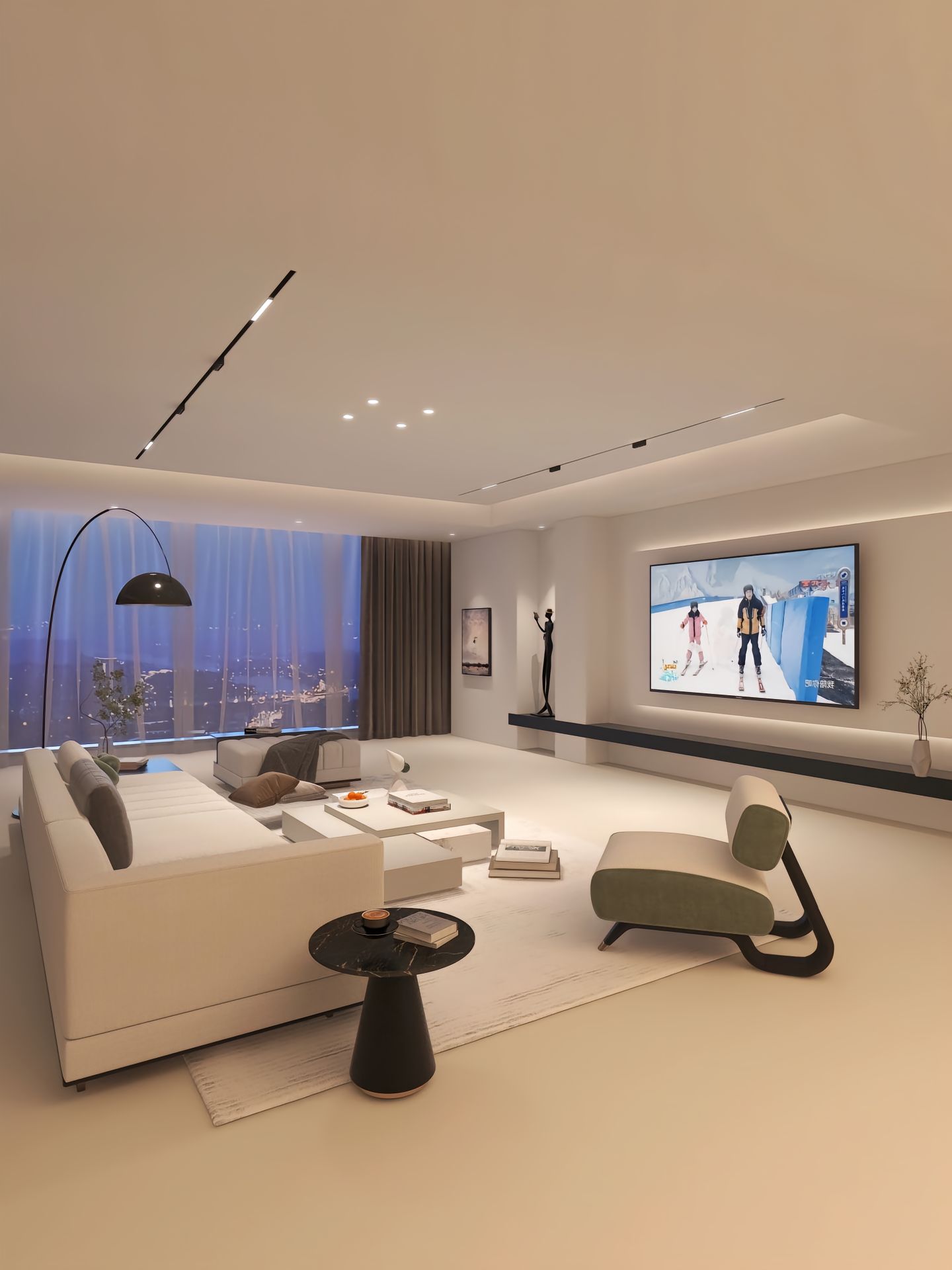 摒棄單一大吊燈,在頂面分散安裝燈帶、筒燈等光源組合?搭配的照明方式。