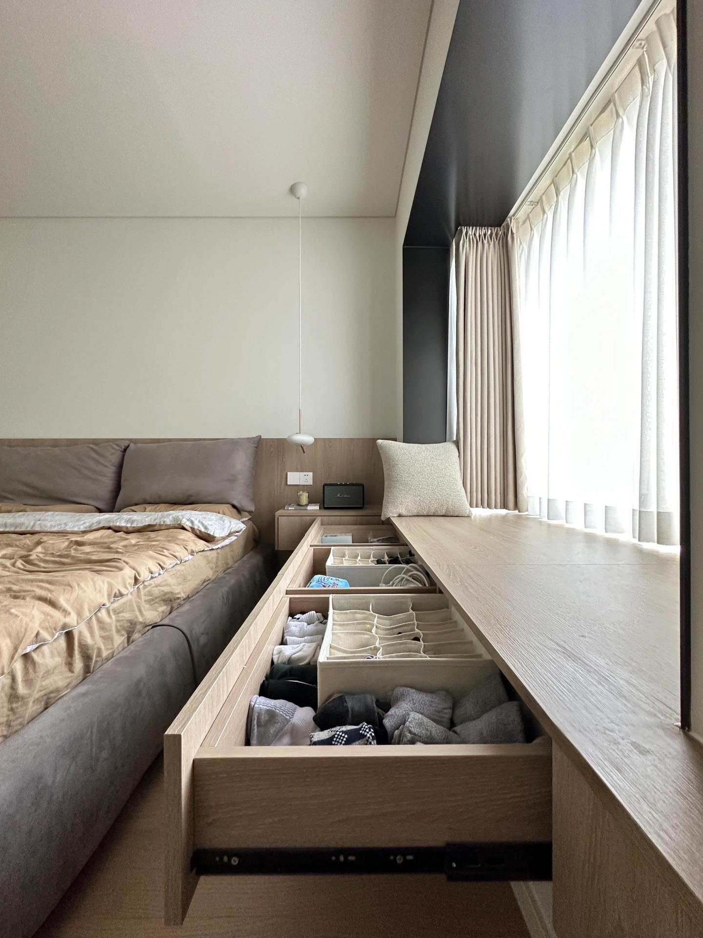 利用原本的飄窗空間來(lái)齊平做榻榻米,延伸部分可做儲物功能,輕松節約小半張床的面積,小臥室兩個(gè)孩子使用也不怕擠了。