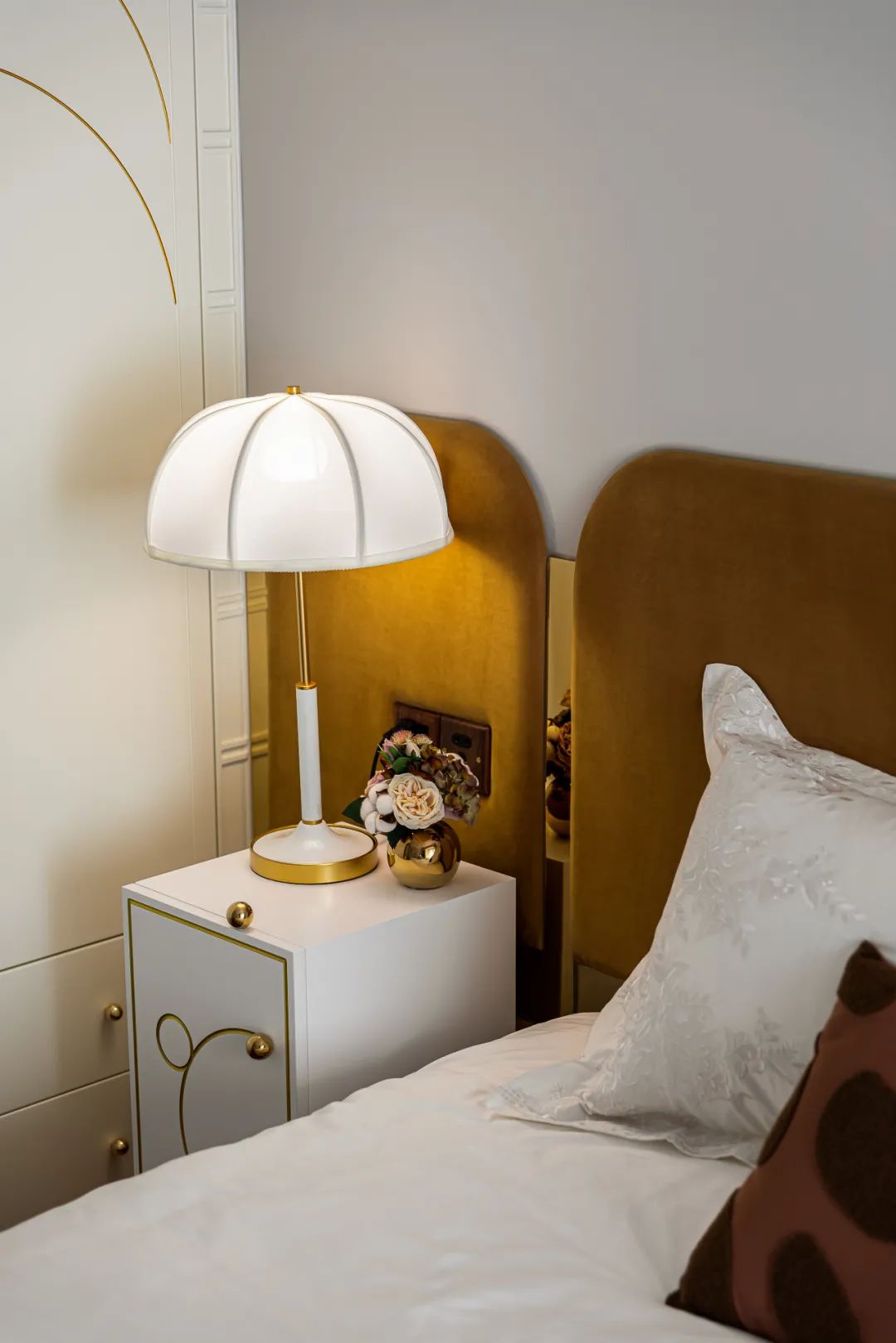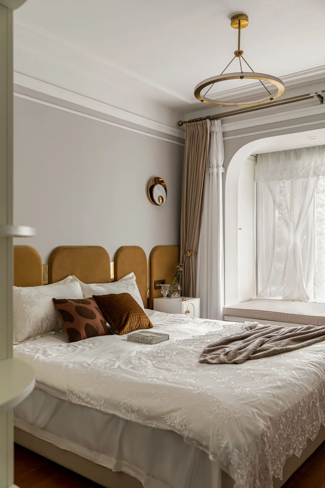 優(yōu)雅浪漫的主臥風(fēng)格,與其他空間截然不同,雅致的淺灰底色,加上靚麗橙色和精致金屬元素的點(diǎn)綴,復古,高貴,優(yōu)雅的氛圍盡顯。柔美精致的蕾絲印花窗簾與床品,讓臥室空間的質(zhì)感更加細膩,也添了幾分少女心,線(xiàn)條感豐富的白色床頭柜。
