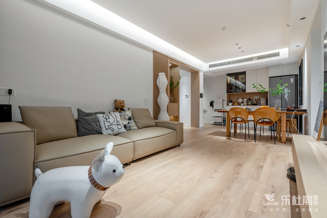除了吊頂為一體之外,客餐廳的地板也選擇了通鋪,公共區域的整體感更強。客餐廳和多功能室設計了一面隔斷,隔斷可以作為收納,也可以作為端景,甚至作為家中軟裝的背景也十分 合適。