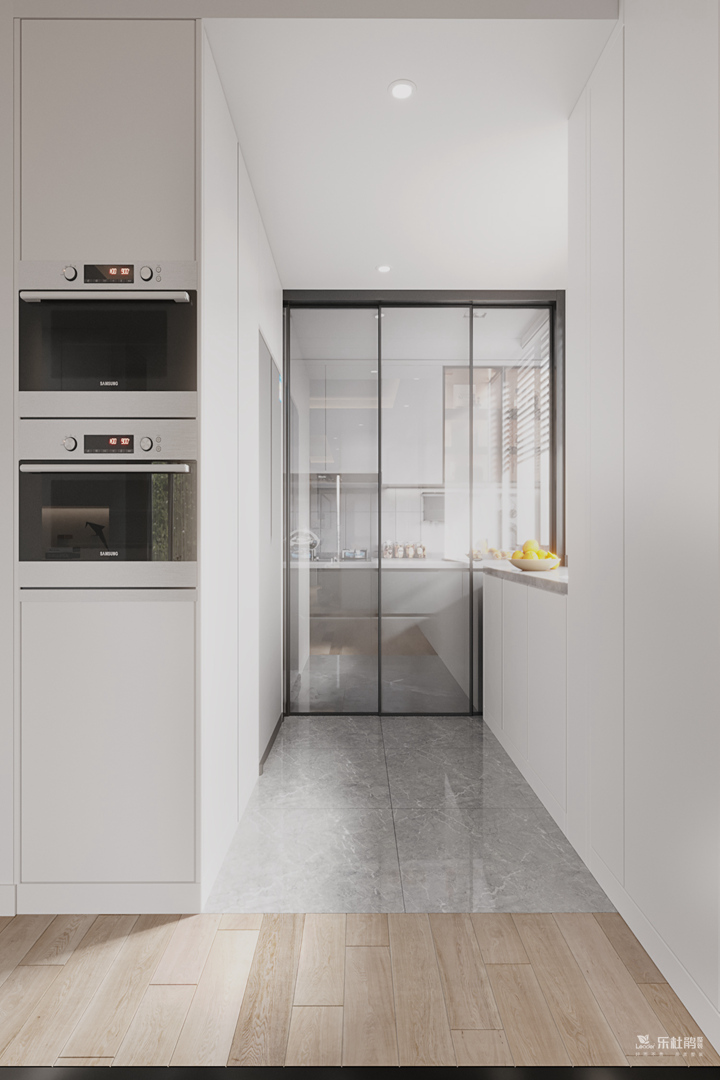廚房區域采用隱形玻璃門(mén)與餐廳隔斷開(kāi),整體都是純白色調,利用飄窗處空間做成U型設計??鞠?、冰箱等電器放置在廚房外,內嵌墻體,合理節省了空間。