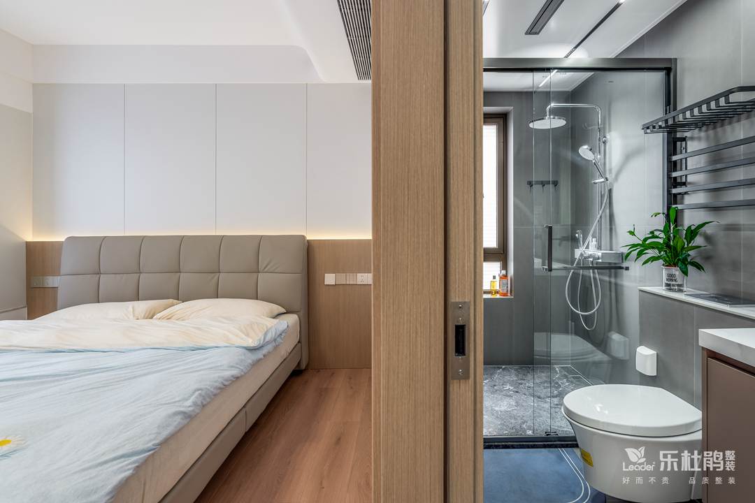 主臥床頭不做背景墻,整體以簡(jiǎn)約大氣為主,臥室通鋪木地板。床頭兩邊護墻板也選用了原木樣式,上方加入燈帶,燈一開(kāi)這氛圍感不就來(lái)了嗎。主臥進(jìn)門(mén)左手邊便是一處U型的書(shū)桌衣帽間,利用書(shū)桌正巧與主臥里隔斷開(kāi),很好的保護了業(yè)主的隱私。