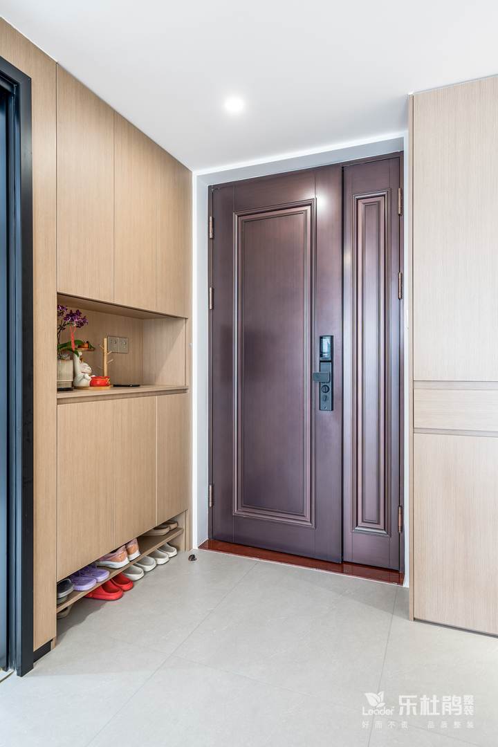 玄關(guān)進(jìn)門(mén)右手邊利用原木元素,打造了一門(mén)到頂的玄關(guān)柜,中間和底部做鏤空處理。底部設計了一層活動(dòng)層板,方便進(jìn)屋更換鞋子。